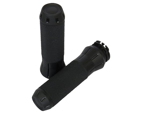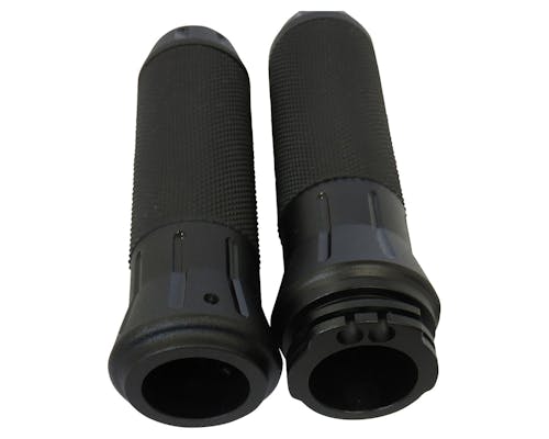 質感がすばらしいカスタムグリップ。 どんなカスタムにもぴったり! グリップ部分には専用のローレットタイプラバーが装着され、 大変握りやすく滑りも防止されております。 右側グリップとワイヤー巻き取り部分が一体のため、 インナースロットルは必要ありません。 左側グリップはハンドルにかぶせてネジで固定するタイプです。 |