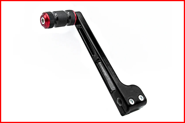それらを象徴する2つのアイテムをご紹介したいと思います。 ペグが付いた方はツアラー用の「シフトペグ」ですが、シフターシャフトに挿すセレーション部分のボルトが二つなのがお判りでしょうか。 これはヒールシフト用のペグを外す事によって生まれる隙間を、シフターアームのクランプを広く(厚く)する事でスペースを埋め、同時にシャフトをガッチリと掴むための工夫なんです。激しいシフトチェンジでセレーションを舐めてしまう事を防ぐワンポイントになっています。