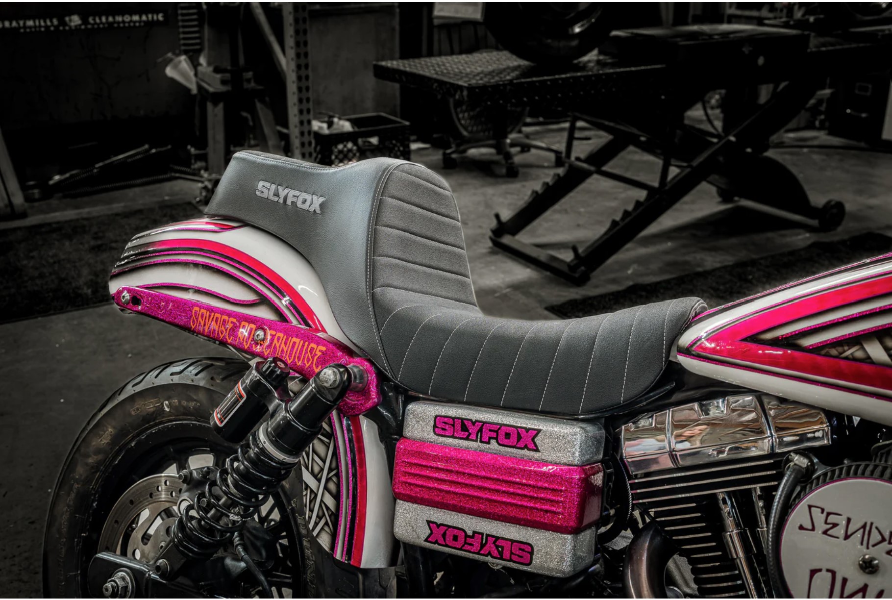 「より軽く、より強く、より速く」 こんなスローガンをかかげメーカーのキャッチコピーにしているSLYFOX。 有言実行の精神でバガーシーンに大きなインパクトを与え、 市場に後発で参入したにも関わず世界中から注目されるブランドになって行ったんです。 ちなみに2023年のDrag Specialtiesの商品カタログ “Fat Book 2023” のカバーバイクに選出されたロードキングは、 同社のパーツによって極限までパフォーマンスが引き出された一台。