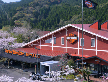 緑一杯の大自然に囲まれた贅沢な環境、アメリカの西海岸の山並みを彷彿させるロケーションに構えるハーレーダビッドソン宮崎!