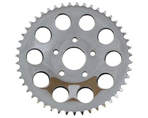 クロームのリアスプロケットです。 リアスプロケットは丁数が多いほど加速(トルク)重視、少ないと伸び(最高速)重視になります。 トランススプロケットとの組み合わせで調整できますので、お好みの調整をどうぞ。 |