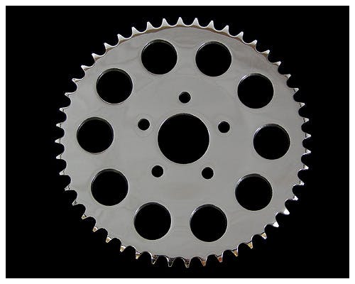 クロームのリアスプロケットです。 リアスプロケットは丁数が多いほど加速(トルク)重視、少ないと伸び(最高速)重視になります。 トランススプロケットとの組み合わせで調整できますので、お好みの調整をどうぞ。 |