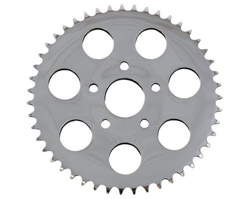 クロームのリアスプロケットです。 リアスプロケットは丁数が多いほど加速(トルク)重視、少ないと伸び(最高速)重視になります。 トランススプロケットとの組み合わせで調整できますので、お好みの調整をどうぞ。 |