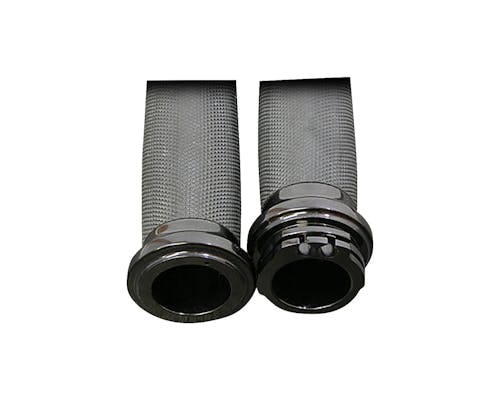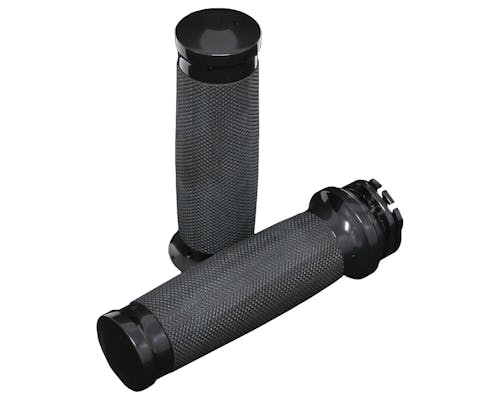 質感がすばらしいカスタムグリップ。 どんなカスタムにもぴったり! グリップ部分には専用のローレットタイプラバーが装着され、 大変握りやすく滑りも防止されております。 右側グリップとワイヤー巻き取り部分が一体のため、 インナースロットルは必要ありません。 左側グリップはハンドルにかぶせてネジで固定するタイプです。 |