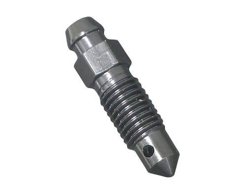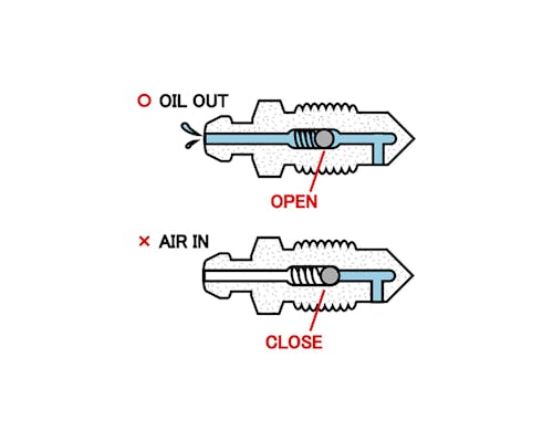 本体内部にワンウェイバルブ構造のある、特殊なブリーダーです。 従来のブリーダーだとブレーキ操作→ブリーダー緩め→ブリーダー締め→・・・ の繰り返しでしたが、 スピードブリーダーならブリーダーを一度緩めたら、後はブレーキ操作で ブレーキオイルをどんどん送り込むだけです。 ワンウェイバルブが逆流を防止。エアを吸い込みません。 ちなみに1/4は六角が小さくなめやすいので、メガネレンチを使用しましょう。 もちろんブレーキ関係のメンテナンス作業はバイクショップに依頼しましょう。 |