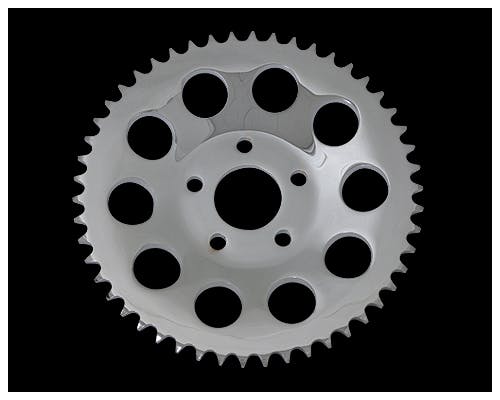 クロームのリアスプロケットです。 リアスプロケットは丁数が多いほど加速(トルク)重視、少ないと伸び(最高速)重視になります。 トランススプロケットとの組み合わせで調整できますので、お好みの調整をどうぞ。 |