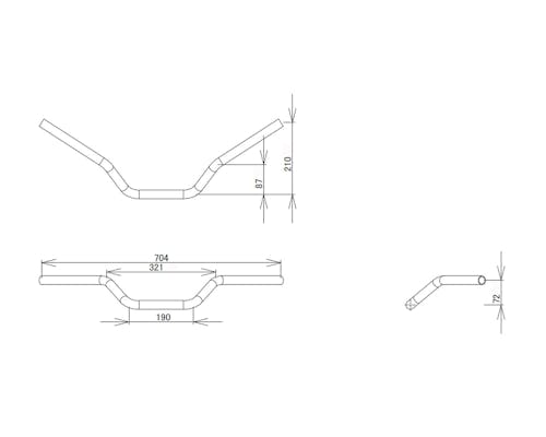全幅約704mm 高さ約72mm プルバック約210mm エンドライズ約72mm 下部幅約190mm(取り付け可能幅では御座いません) ※対応純正ハンドル(OEM品番:55845-04)に対し グリップ位置手前に70mmバック。 |