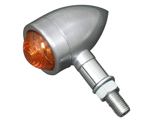 小ぶりなバレットウインカーです。 ハンドル周り、リア周りをスッキリさせたいときに重宝しますよ。 こちらはクラシカルなノーマルバルブタイプです。 オールドスクールカスタムにどうぞ! |