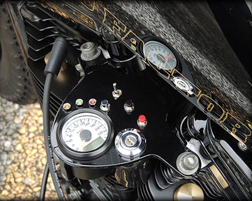 エンジンマウントと48mmメーターを付けられるステーが一体になりました! 当店の48mmメーターがスッキリとマウントできるスグレモノです。 さらにイグニッションスイッチや、インジケーターランプも移設可能。 とにかく便利なモーターマウントです。 もちろんスピードメーター以外の48mmメーターもOKです。 |