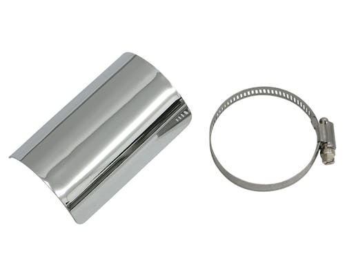 プレーンタイプのヒートガードです。 ヒートシールドとも呼ばれていますね。 熱々のマフラーによる思わぬ火傷や、 ズボンやブーツの焦げを予防するのは勿論の事、 パイプの錆びてしまっている部分を隠す使い方や、 装飾のアクセントとしてもご利用ください。 |