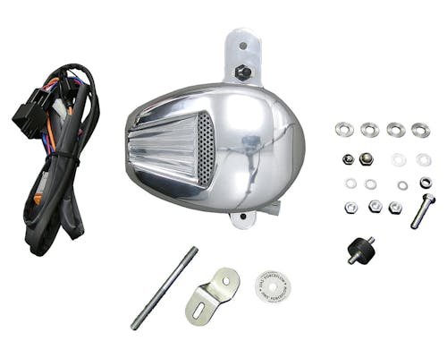 空冷のハーレーは走行をしていないとエンジンが風で冷やされず、 渋滞等に巻き込まれて停止時間が長くなるとオーバーヒートを起こすリスクがありますが、 ホーンマウント部に位置するシリンダークーラーがサーモスタット機能でエンジンの温度を感知し、 強力なモーターによってファンブレードが回転する事で風を直接エンジンに当てて油温上昇を防ぐ、 日本の道路事情にはもってこいのアイテムです。 もちろんサーモスタットはスイッチでON/OFFが切り替えられると共に、 エンジン温度が一定以上になって初めてファンが動作する仕様ですので、 オーバークールの心配も無く一年中装着したままで問題無いですし、 内部にはホーンが備わっており移設の心配もありません。 参考記事 取扱説明書 |