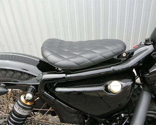 ソロシートです。シングルシート、サドルシートともいいますね。 オールドスクールチョッパーには欠かせません。 アンダーには関連商品に記載のソロシート用アンダーブラケットを使ってください。 素材は合皮ですが、質感はかなり良いです。 |