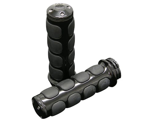 クリアキンがリリースするグリップです。 ゴム部分がやや盛り上がっており、滑りにくくなっています。 シンプルなデザインで、特に高年式車輌やハイテクカスタムの車輌に似合います。 通常のグリップに比べ重厚感がありますので、ファットバーは特にオススメです。 |