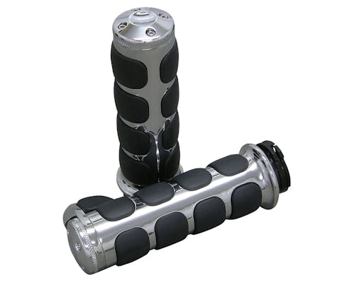 クリアキンがリリースするグリップです。 エンド部分にスロットルサポートが付いており、長時間の運転に力を発揮します。 またこの部品は取り外し可能なので、シンプルにしたい時は取ってしまう事も。 通常のグリップに比べ重厚感がありますので、ファットバーは特にオススメです。 |
