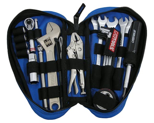 ・コンビネーションレンチ 10mm ×1本 3/8in ×1本 7/16in ×1本 1/2in ×1本 9/16in ×1本 ・モンキーレンチ ×1本 ・バイスプライヤー ×1本 ・ドライバーグリップ ×1本 ・ドライバービット +(PH1)/-(3mm) ×1本 ・スパークプラグソケットヘッド(5/8) ×1本 ・ヘックスレンチ 1/8 ×1本 5/32 ×1本 3/16 ×1本 1/4 ×1本 5/16 ×1本 ・トルクスレンチ T25 ×1本 T27 ×1本 T40 ×1本 ・ラチェットハンドル ×1本 ・ソケットヘッド 1/2in ×1本 7/16in ×1本 3/8in ×1本 10mm ×1本 ・ソケットエクステンション ×1本 ・エアゲージ ×1本 ・ギャップゲージ ×1枚 ・結束バンド ×5本 ・針金 ×1本 ・ビニールテープ ×1巻 ・ウェス ×1枚 ・ポーチ ×1枚 |