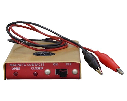 マグネトーコンタクトの開閉を確認する事が出来ます。 マグネトータイミングを確認するには必須のツールです。 マグネトーに接続しても本テスターが動作しない場合には、 3~5Ωのイグニッションコイルの1次側に赤線・黒線を接触させると、 本体が動作しているか否かの確認が可能です。 |