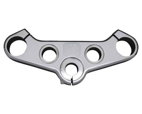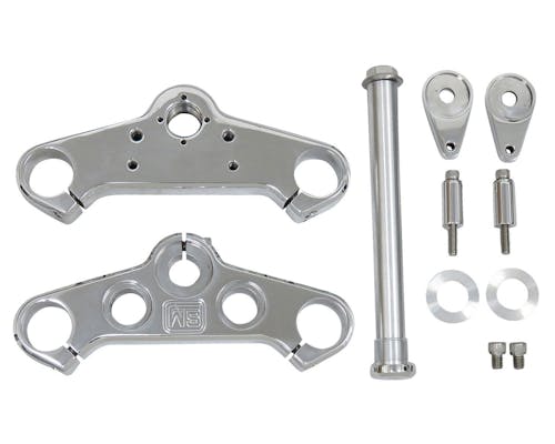 SPEED MERCHANT製の39mmミッドグライド用ビレットトリプルツリーです。 同ブランドの神髄でもある高精度・高強度でグッドルックスな造りこみを、 6061ビレットアルミニウム削り出しという形でトリプルになりました。 CNCマシニングでデザインの美しさはもちろん、 高速走行時になるとわかる安定性が自慢のパーツです。 付属のパーツで純正の吊り下げヘッドライトバイザーに対応致します。 もちろんボトムマウントにも対応。 一般的にスポーツ仕様ディメンション等でリアの車高を上げることで、キャスターが立ち上がり、 トレールが減少することにより高速域での直進安定性がスポイルされてしまいます。 そのようなカスタムの場合にも直進安定性を向上させるために、 ステアリングステムとフォークチューブのオフセットを約1/2インチ詰めることで、 アクスルを車体側に寄せトレールを増やし、安定性を狙っております。 スポーツレプリカやオフロードバイクに見られるトリプルセッティングのように、 ツリーを真上から見て、ステアリングステムと左右のフォークチューブトップが、 直線に近づくようなイメージを模範としております。 ストック車高やローダウンした際にも、より高速域での安定性を求める場合にも最適です。 美しいデザインでイメージチェンジと共にフォーク剛性も増します! Made in California,U.S.A. |