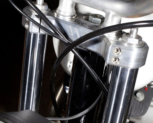組みつけの際は各種工具と専門的な知識、作業スキルが必須の為 弊社では技術力のあるカスタムショップ等での取り付けをお勧め致します。 純正ハンドルロック機構は使用できません。 39mmナローグライドモデルへは専用品をご用意しております。 ※純正スピードメーター機器の移設が必要になるのと、 純正ボトムマウントヘッドライトはご使用いただけません。 バイザー吊り下げタイプのヘッドライトを別途ご用意ください。 3枚目画像のイメージは39mmナローグライド用ブラックのものとなります。 別売りのヘッドライトブラケット -17Y 5-3/4" をご使用頂くとボトムマウントが可能です。 |