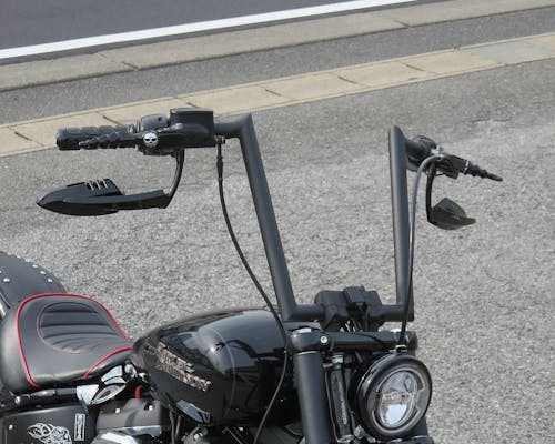 死神の鎌をイメージしたクールなデザインのファットエイプハンドルです。 絶妙な垂れ角の形状がアクセントになりますね。 電子スロットルにももちろん対応します。 米国トップメーカーの独自製法による優れた強度と 美しいブラックパウダーコートのフィニッシュが最大の特徴です。 |