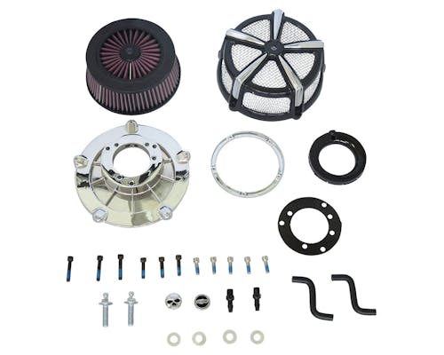ハイフロータイプのK&N製のフィルターが標準装備された 最高のパフォーマンスを求めたクリアキン製のカスタムエアークリーナーです。 ブラケット、ブリーザーキット等が含まれたコンプリートキットとなっております。 別売りのメダリオンを装着する事によりカスタムバリエーションがアップします。 |