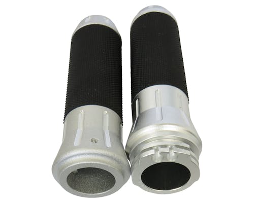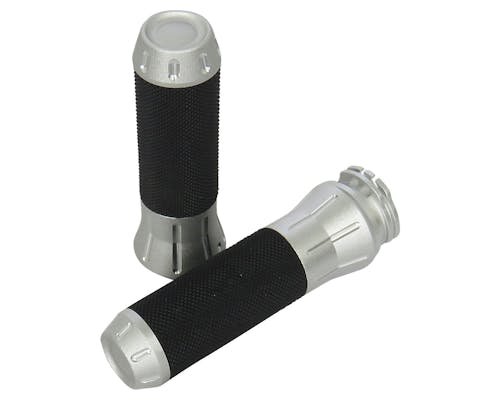 質感がすばらしいカスタムグリップ。 どんなカスタムにもぴったり! グリップ部分には専用のローレットタイプラバーが装着され、 大変握りやすく滑りも防止されております。 右側グリップとワイヤー巻き取り部分が一体のため、 インナースロットルは必要ありません。 左側グリップはハンドルにかぶせてネジで固定するタイプです。 |