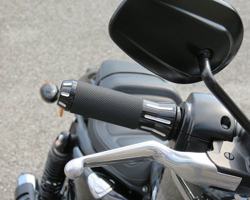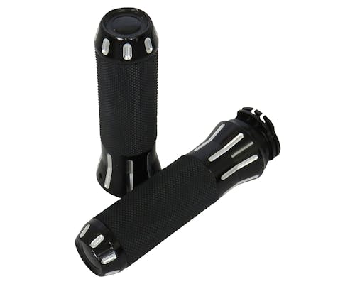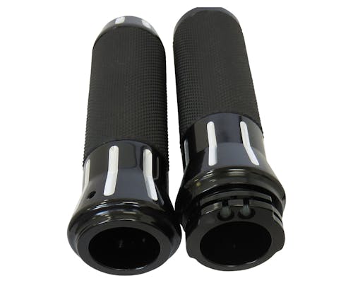 質感がすばらしいカスタムグリップ。 どんなカスタムにもぴったり! グリップ部分には専用のローレットタイプラバーが装着され、 大変握りやすく滑りも防止されております。 右側グリップとワイヤー巻き取り部分が一体のため、 インナースロットルは必要ありません。 左側グリップはハンドルにかぶせてネジで固定するタイプです。 |
