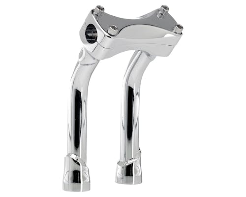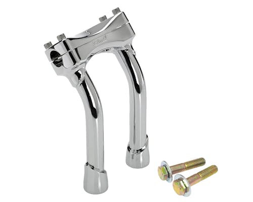 外径1インチ、厚み約3mmの4130クロモリチューブをTIG溶接し、 さらに1つ1つハンドポリッシュにて下処理を施してあります。 クローム仕上げで、溶接模様も非常にきれいなライザーです! トップクランプのボルト位置には、純正のメーターブラケットが使用できます。 ライザーが中空になっているので、加工次第では配線の中通しも可能です。 旧品番:MP-008-HD-CP |