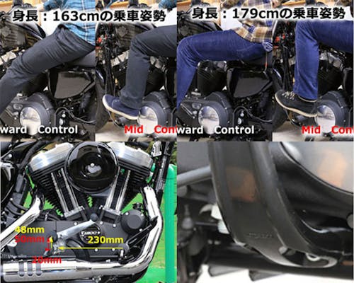純正フォワードコントロールのポジションから230mmバック 48mmアップ 純正ミッドコントロールのポジションから、20mmフォワード 50mmアップ |