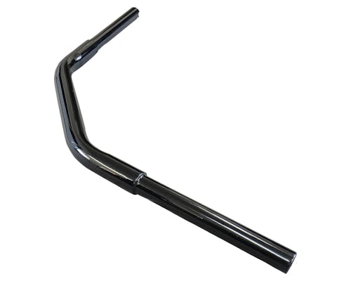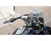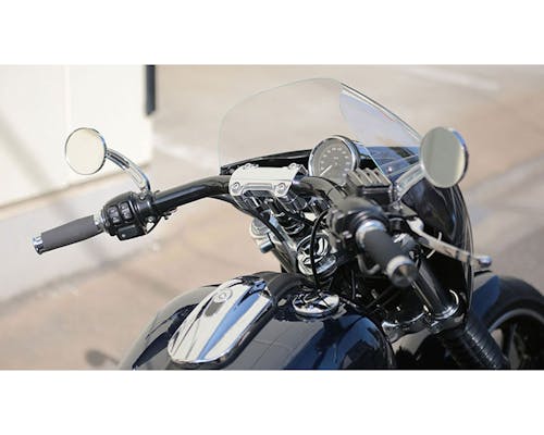 電子スロットル車輌にも対応しており、 スイッチボックスの配線等を中通し可能なホールが備わっています。 クランプ部分も含めて1-1/4inファットバー仕様となっており、 35°の曲げ角は迫力のある印象を与えます。 |