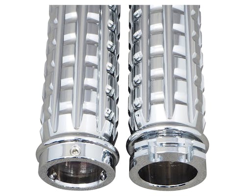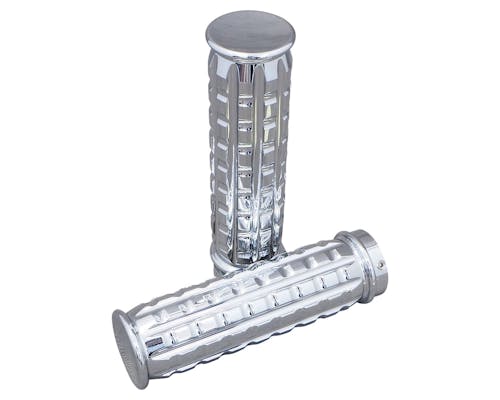 大きく溝のあるカスタムグリップです。 どんなカスタムにもぴったり! 右側グリップとワイヤー巻き取り部分が一体のため、 インナースロットルは必要ありません。 左側グリップはハンドルにかぶせてネジで固定するタイプです。 |
