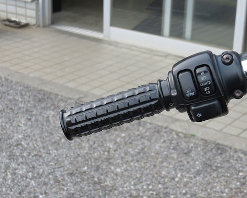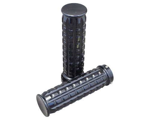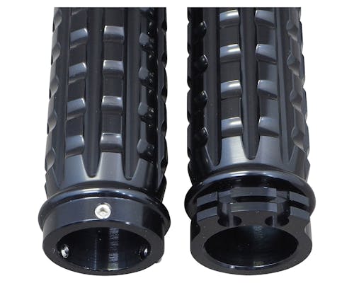 大きく溝のあるカスタムグリップです。 どんなカスタムにもぴったり! 右側グリップとワイヤー巻き取り部分が一体のため、 インナースロットルは必要ありません。 左側グリップはハンドルにかぶせてネジで固定するタイプです。 |