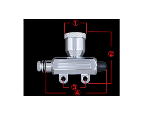 1蓋径:約30mm 2高さ:約70.50mm 3中心間:約30mm 4全長:約83.50mm 本体厚さ:約23mm 取り付け穴:約6mm バンジョーサイズ:3/8-24 ボア径:14mm リザーバータンク固定ネジサイズ:M15-1.0 |