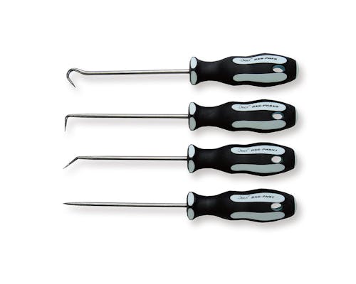Deen製のミニピックツール4本セットです。 4種類の先端形状で、コジリ、ケガキ、Oリング外しなど使い方色々で便利アイテム間違いなしです。 |