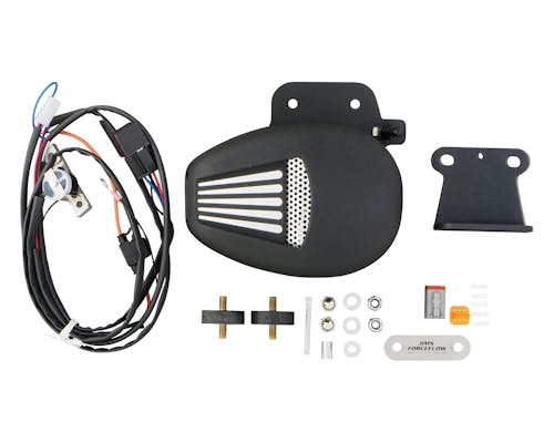 空冷のハーレーは走行をしていないとエンジンが風で冷やされず、 渋滞等に巻き込まれて停止時間が長くなるとオーバーヒートを起こすリスクがありますが、 ホーンマウント部に位置するシリンダークーラーがサーモスタット機能でエンジンの温度を感知し、 強力なモーターによってファンブレードが回転する事で風を直接エンジンに当てて油温上昇を防ぐ、 日本の道路事情にはもってこいのアイテムです。 もちろんサーモスタットはスイッチでON/OFFが切り替えられると共に、 エンジン温度が一定以上になって初めてファンが動作する仕様ですので、 オーバークールの心配も無く一年中装着したままで問題無いですし、 内部にはホーンが備わっており移設の心配もありません。 参考記事 メーカーインストラクション |