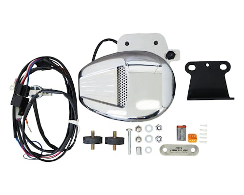 空冷のハーレーは走行をしていないとエンジンが風で冷やされず、 渋滞等に巻き込まれて停止時間が長くなるとオーバーヒートを起こすリスクがありますが、 ホーンマウント部に位置するシリンダークーラーがサーモスタット機能でエンジンの温度を感知し、 強力なモーターによってファンブレードが回転する事で風を直接エンジンに当てて油温上昇を防ぐ、 日本の道路事情にはもってこいのアイテムです。 もちろんサーモスタットはスイッチでON/OFFが切り替えられると共に、 エンジン温度が一定以上になって初めてファンが動作する仕様ですので、 オーバークールの心配も無く一年中装着したままで問題無いですし、 内部にはホーンが備わっており移設の心配もありません。 参考記事 メーカーインストラクション |