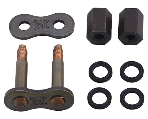江沼チェーンのQXリングシールチェーン用のスクリュージョイントです。 チェーンを詰めるときなどの連結にお役立て下さい。 EKスクリュージョイントは長年の経験を生かし、 ジョイントの取り付けミスを防ぐタイプにモデルチェンジしました。 カシメをするための専用工具が要らず、 必要なのは10mmスパナとペンチのみです。 まさに「Do It Yourself」にうってつけのジョイントです。 |