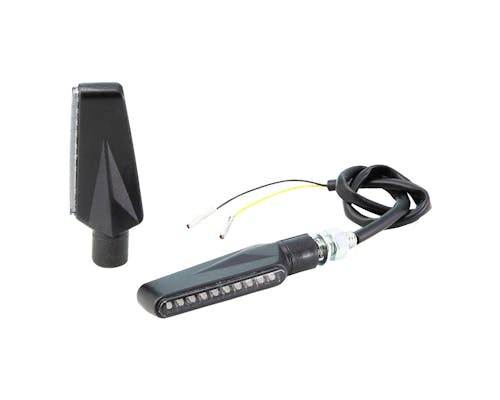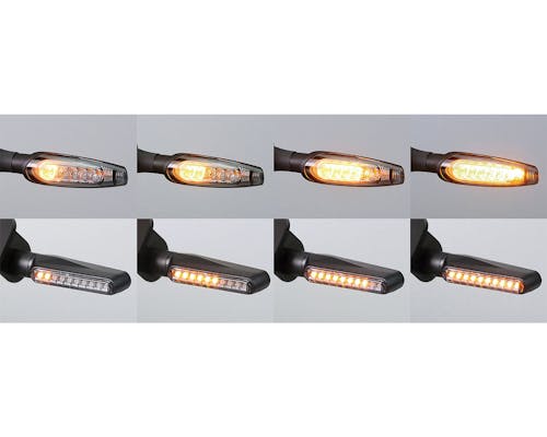 配列された10個のLEDが連続して流れるように光るシーケンシャルウインカーです。 シーケンシャルは車に採用されているのを見かけますが、 今ではオートバイでもマストなカスタムアイテムとなっております。 LEDなので被視認性も良く、車両のイメージアップはもちろんの事、 Eマーク(50R)取得品ですので安心してご利用頂けます。 |