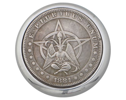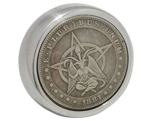 アルミ材を削り磨き出しビンテージテイストのコインを埋め込んであるシフトノブです。 ハンドポリッシュにより全体的に優しいアールが掛かっています。 異教の神とされるBaphometがデザインにあしらわれたコインです。 全てMALCOM SUPPLY ファクトリーにてハンドメイドされています。 Made in Tokyo. |