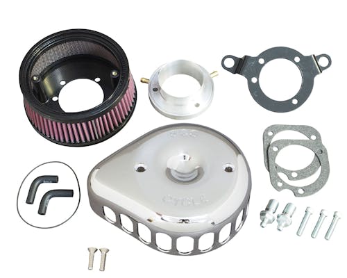 S&Sの最新作ティアドロップです。 オリジナルティアドロップのカバー同様に中央部の凹みにより エアクリーナー内部の空気の流れを整え効果的な吸気を実現しています。 アップマフラーであるS&S Hooligan 2-2フルエキゾースト装着車両は エアクリーナーとエキパイの干渉を避けられるこちらがオススメです。 |