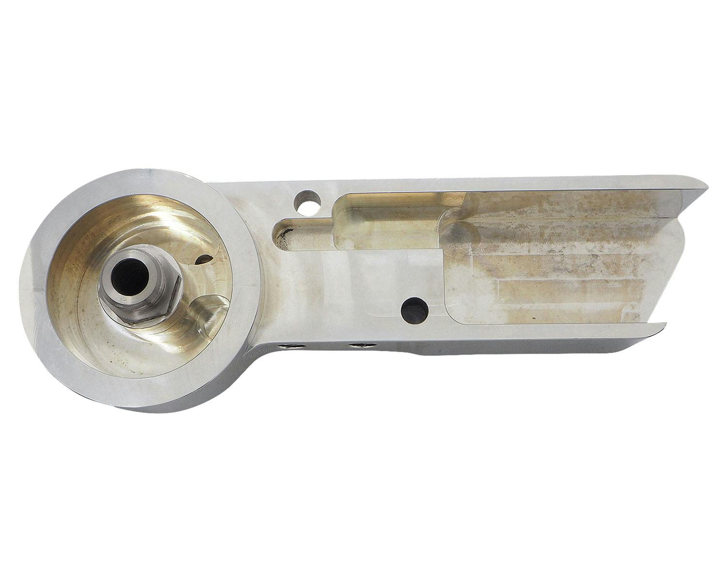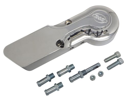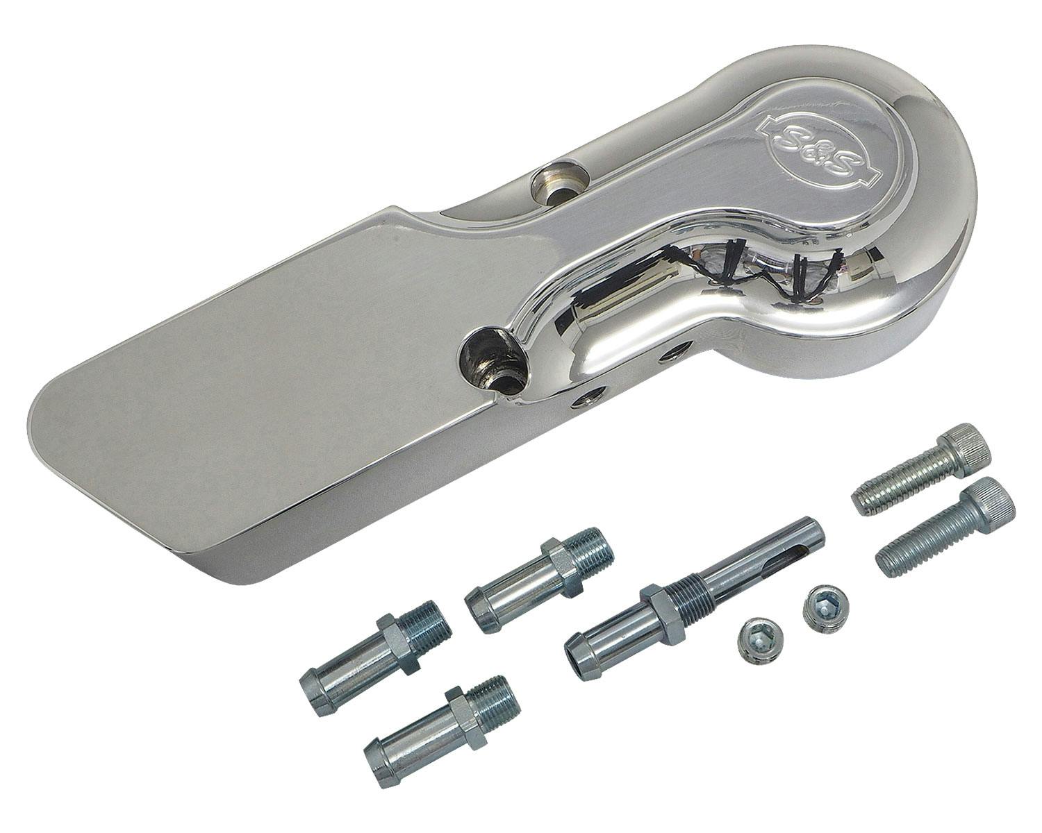 S&S製ビレットアルミオイルフィルターブラケットです。 取り付け位置を工夫する事で、クランクケースとの隙間を作り、 フィルターの取り外しを容易にしており、 オイルクーラー用のホース取り出し口も備わっています。 |