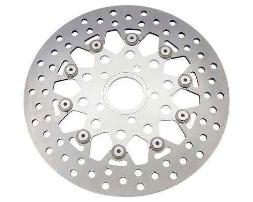 GTSのフローティングディスクローターです。 フローティングローターはリジット固定に比べ、 ロータに生じる車軸方向の応力が軽減されるため、熱変形が抑えられる他、 ハブやホイールに伝わる熱を軽減させるなど、メリットが豊富です。 レーザーカット加工で精密に仕上げられ、 軽量化のためインナーとコネクトピンはアルミが使われています。 |