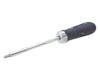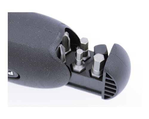 ハンドル部先端のシルバーの部分を回すことで右回し、 固定、左回しの切り替えが可能です。 握ったままハンドル中央のボタンを押しながら回すことでピストルグリップに可変し、 まっすぐな状態よりもトルクをかけて作業がしやすくなります。 ハンドル両サイドに付いている「PUSH」ボタンを両側から押すと グリップエンドのビット収納が開きます。 シャンクはマグネットでビットを保持するようになっており、 一般的な1/4"ビットをご使用いただけます(両頭ビットは使用不可)。 また、シャンクは別売りの50mmシャンクや1/4sqシャンクと差し替えることができるので、 作業内容に最適なものをお選びいただけます。 使わない時はシャンクを抜いておくことで、コンパクトに収納することができます。 |