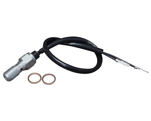 GTSのブレーキスイッチ付きのバンジョーボルトです。 主にシングルディスクのマスターシリンダーに使用します。 ハウジングを交換して、レバーにブレーキスイッチが付かなくなった場合、 このバンジョーを使用することで油圧式のスイッチに換装できます。 |