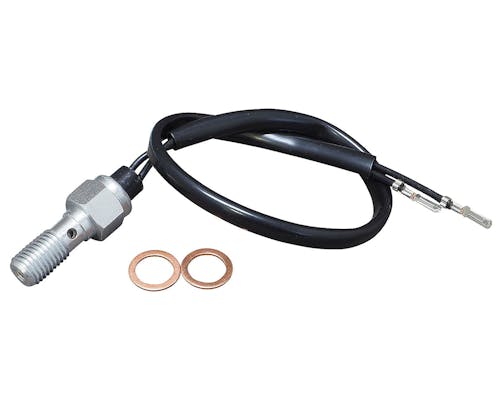 GTSのブレーキスイッチ付きのバンジョーボルトです。 主にシングルディスクのマスターシリンダーに使用します。 ハウジングを交換して、レバーにブレーキスイッチが付かなくなった場合、 このバンジョーを使用することで油圧式のスイッチに換装できます。 |