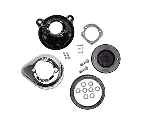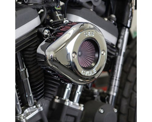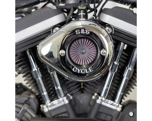 S&SがリリースするNEWデザインのエアクリーナーキットです。 中央にある大きなセンターホールと外周のスリットによって、 フィルターの表面積を最大限に生かし、 純正エアクリーナーと比較して55%もの吸気効率の向上が図られています。 タービン状のエレメントもレーシーな印象で見た目のルックスも斬新です。 |