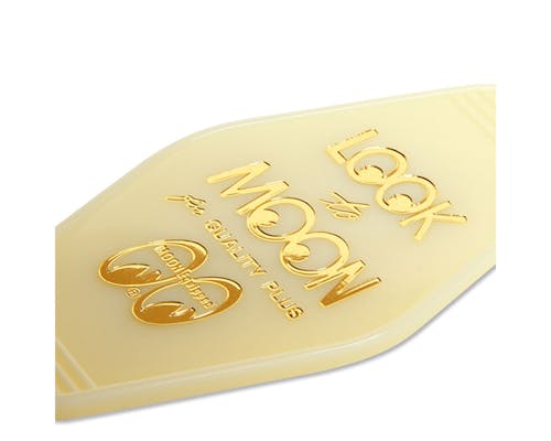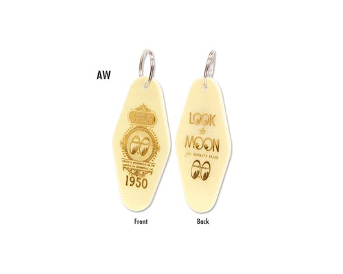 MOON Equippedブランドのクラシカルなキータグです。 1960年代頃にUSAのホテルやモーテルなどで使用されていた 当時のルームキータグをイメージしてデザイン! 限界までディテールにこだわり、まるで当時MOON Equippedのホテルが 実在していたかのようなデザインです。 ルーム ナンバーの変わりに、1950年MOONEYES USAが創設された年が入っています。 バックにはLOOK to MOON for QUALITY PLUSのレタリングが入っており、 デザインはゴールドの箔押しでリッチな仕上がりになっています。 愛車や家のキーホルダーとしてだけではなく、置いておくだけでも USAな雰囲気を出してくれるアイテムです。 |