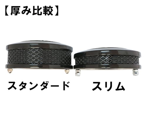 ※厚み比較画像は『ブラック』を使用しておりますが、 当商品は『クローム・スリムタイプ』となります。 ご注文の際はご注意下さい。 純正CVやEFIに取り付ける場合はSU/CV変換アダプターとブリーザーキットを別途ご用意下さい。 |
