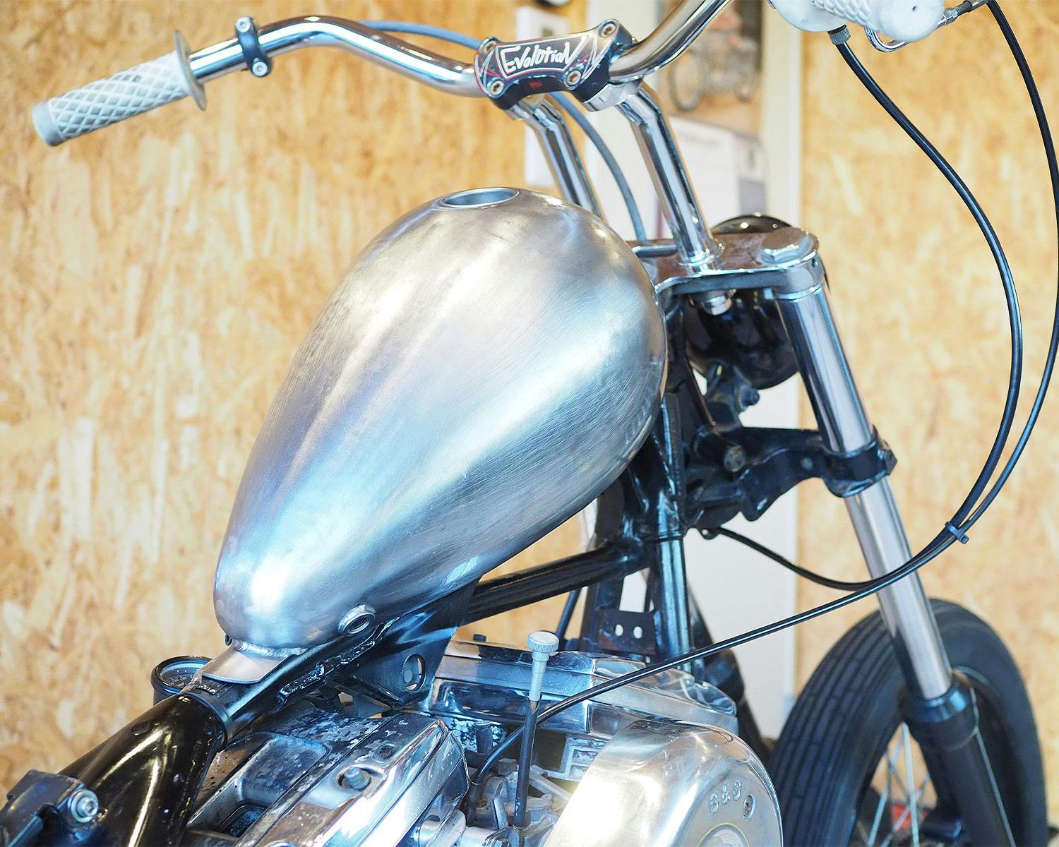 チョッパーガスタンクです。ガスキャップはカムタイプです。 その名の通り、チョッパーの定番ですね。 ガスキャップは右用が対応します。 適合するキャップやガスコック、プラグボルトは関連商品をご覧下さい。 ![]() |