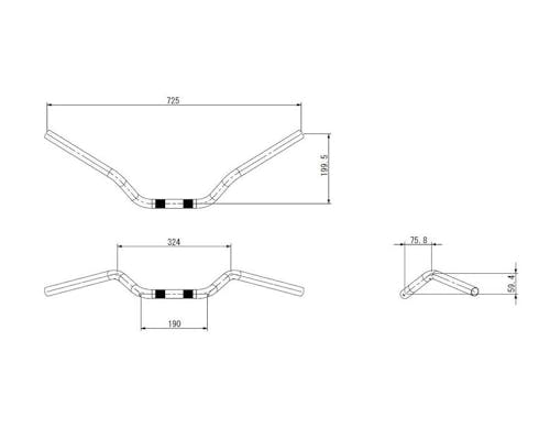 全幅約727mm 高さ約75.8mm プルバック約199.5mm エンドライズ約59.4mm 下部幅約190mm(取り付け可能幅では御座いません) ※対応純正ハンドル(OEM品番:56014-09A)に対し グリップ位置手前に30mmバック。 |