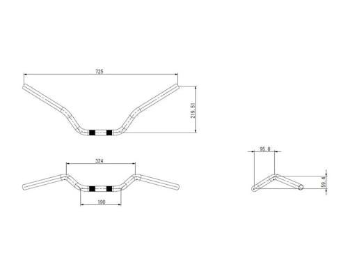 全幅約725mm 高さ約95.8mm プルバック約219.51mm エンドライズ約59.4mm 下部幅約190mm(取り付け可能幅では御座いません) ※対応純正ハンドル(OEM品番:56014-09A)に対し グリップ位置手前に50mmバック。 |